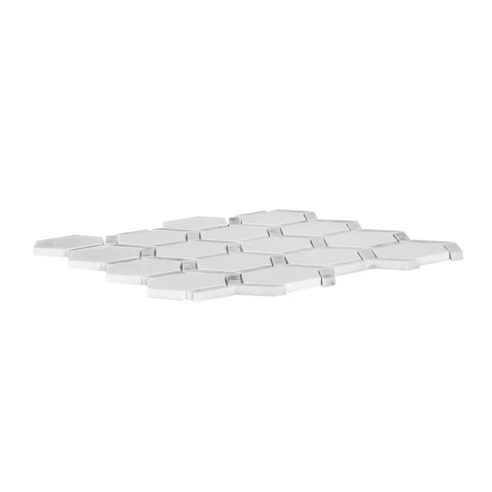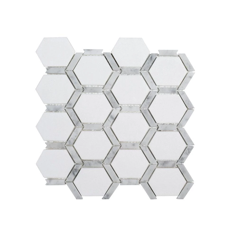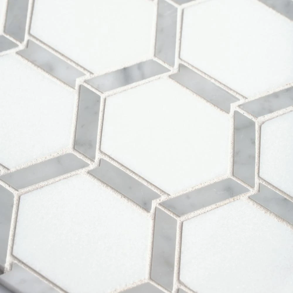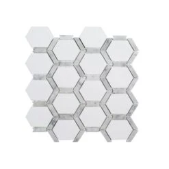 Give your room a quiet confidence with the Norton 11.75 in. x 11.375 in. Marble Mosaic Tile. The white and gray marbles come in a honed and polished finish, respectively, and arranged in a beautiful hexagon pattern that adds a brilliant look to any space. It’s the perfect tile for adding or completely renovating floors, kitchen and bathroom backsplashes, and most other designs and installations.