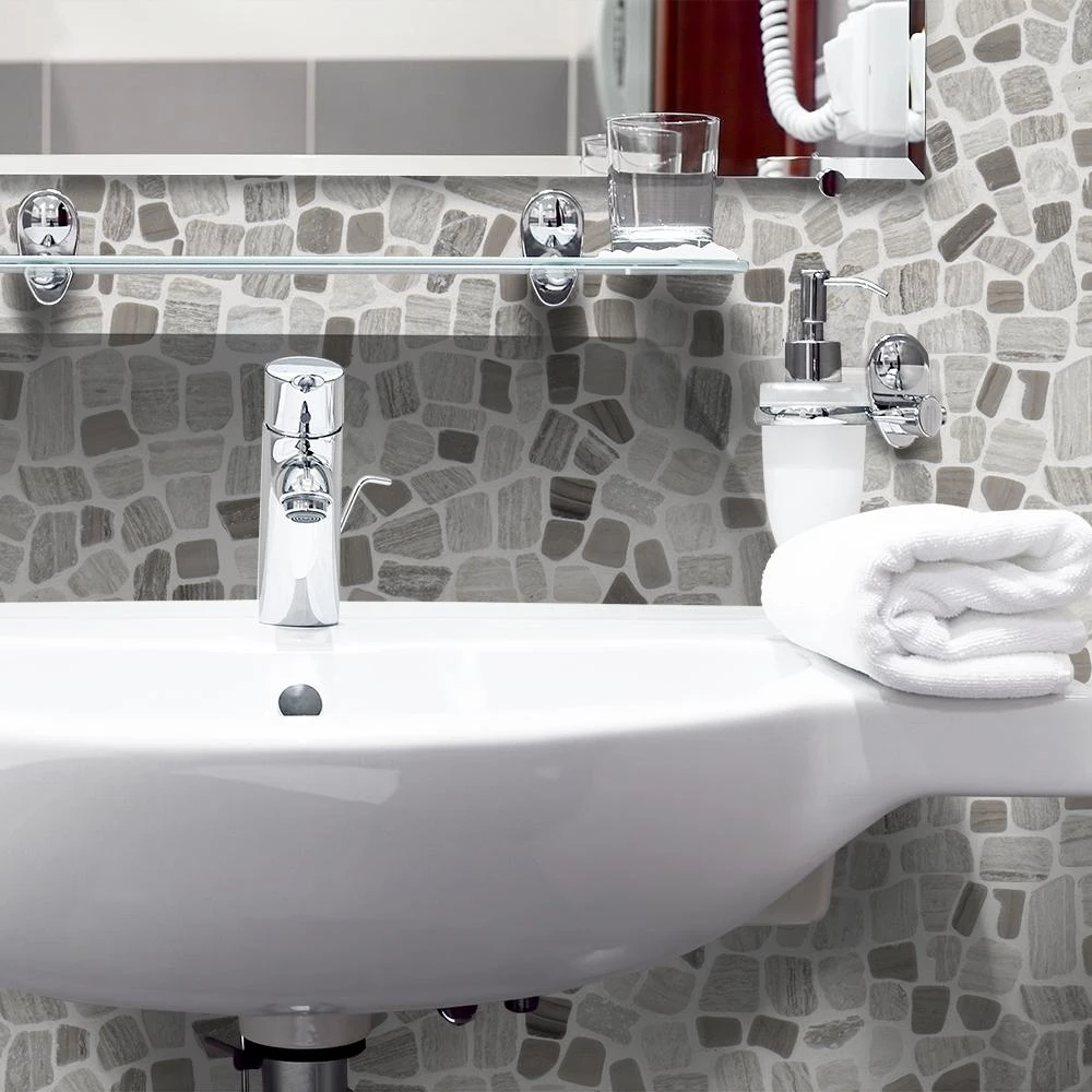 Bailey Grey Pebble 12 in. x 12 in. Honed Limestone Mosaic Tile allows you to add a natural stone look to any installation. The mesh-mounted mosaic features a natural color palette that allows it to be easily combined with other natural stone field tiles and mosaics. Recommended for kitchens, backsplashes, showers, accent walls, tub surrounds and vanities. Due to the natural properties of the stone, color appearance may change based on installation environment, especially in wet areas. For best installation results, use a white polymer-modified thinset. A penetrating sealer is also recommended before grouting.
