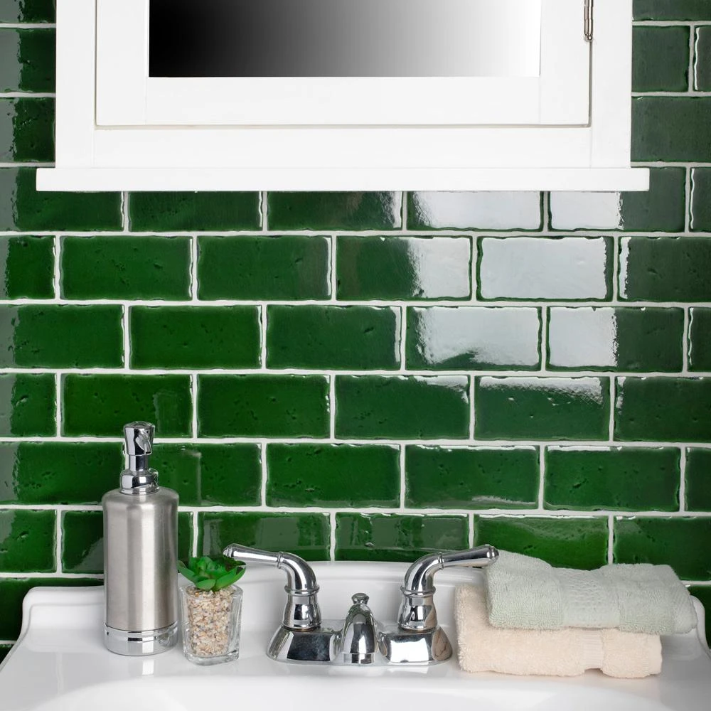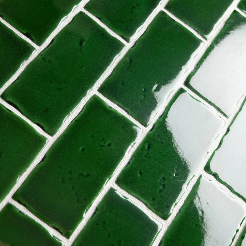 Capture a handcrafted, artisan appearance that seems to have been derived directly from twentieth-century Spain with the Merola Tile Novecento Verdin 2-1/2 in. x 5-1/8 in. Ceramic Subway Wall Tile. With a forest green hand-painted crackle watercolor glaze, this rustic tile offers a glossy, reflective finish for a glass-like appearance. Asymmetrical edges and a smooth surface with varying indentations throughout this glossy tile fashion a handmade appearance. Derived from the classic subway format, this tile is tastefully smaller for a distinctive, unexpected design element. Due to its partially handmade process, each tile could offer slight size variation. This old-world tile is great as a cohesive look or paired with other items in the Novecento program. Intended for interior wall use, this tile is an excellent selection to accent your backsplash, shower wall, fireplace facade or accent wall. It is necessary that you seal this tile before grouting to prevent the absorption of staining agents over time.