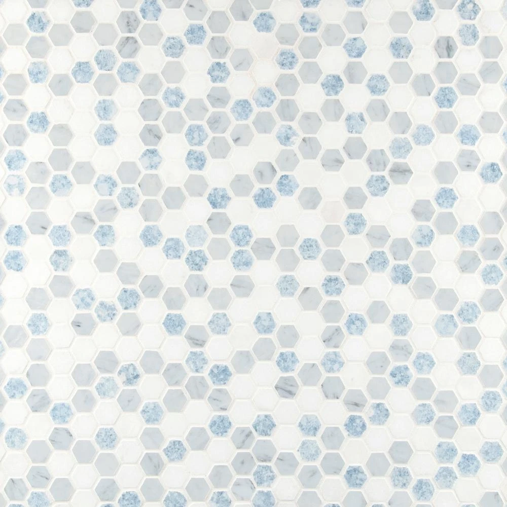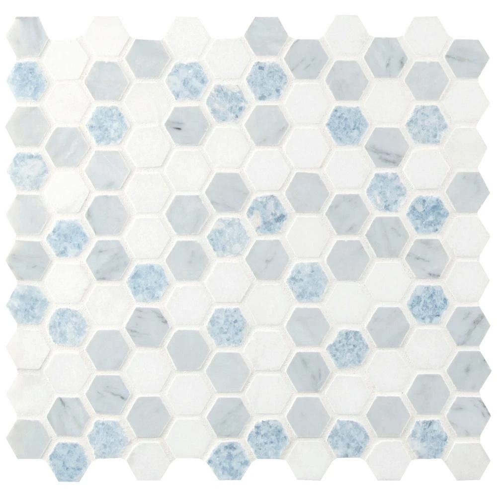 Random-toned Azula Hexagon pieces comprise this fabulous 11.81 in. x 11.61 in. Polished Marble Mosaic Tile from MSI. It is suitable for use with subsurface heating elements and is semi-vitreous, so installation options are plentiful for floors and walls in bathrooms, kitchens, hallways and walk-in closets. Frost resistance makes them suitable for exterior applications and they are highly skid-resistant to foster solid footing. Use this mesh-mounted tile in any commercial or residential setting for an upscale, affordable look. Note: inspect all tiles before installation. Natural stone products inherently lack uniformity and are subject to variation in color, shade, finish etc. It is recommended to blend tiles from different boxes when installing. Natural stones may be characterized by dry seams and pits that are often filled. The filling can work its way out and it may be necessary to refill these voids as part of a normal maintenance procedure. All natural stone products should be sealed with a penetrating sealer.